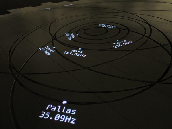 Dans Ellipses, les orbites des planètes, planètes naines et principales comètes du système solaire sont gravées sur une surface au sol. La position actuelle de chaque astre et la note correspondante sont vidéoprojetées sur leurs orbites. Le son associé à chaque astre est une fréquence quasi pure, selon la définition proposée par l’astrophysicien Johannes Kepler (XVIème s.) dans Harmonices Mundi, diffusée dans l’espace d’exposition en fonction de sa position dans le système solaire. Cet ensemble crée une harmonie qui évolue lentement en continu en fonction du parcours des astres. De ces mouvements immuables et pourtant quasi imperceptibles à notre échelle se compose la partition d’une musique des sphères retranscrite en temps réel. Le spectateur peut ici se déplacer sur cette structure pour expérimenter un accord unique correspondant à l’instant présent.